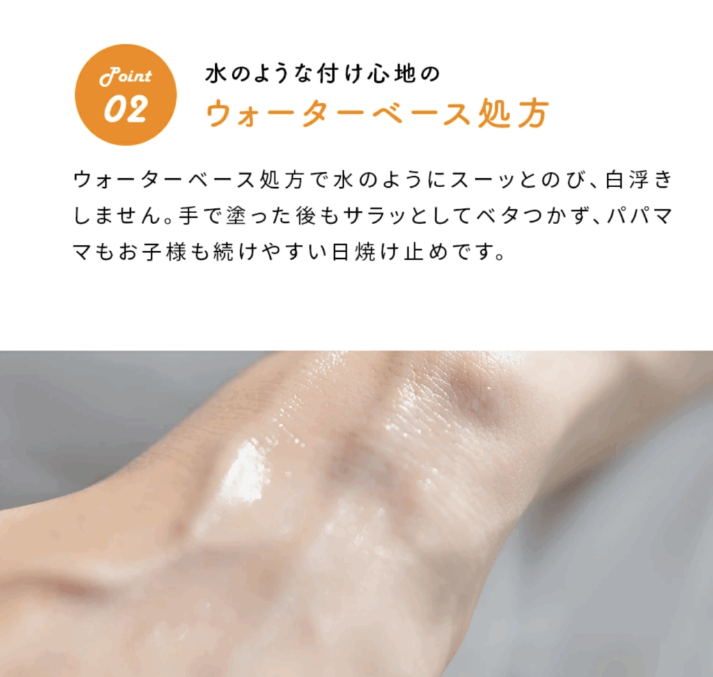 塗った時にべたべたする日焼け止めは赤ちゃんが嫌がることも。さらっとした塗り心地のものなら塗りやすく塗った後も快適です。ローションタイプやミルクタイプなら赤ちゃんにも塗りやすく軽い使い心地なのでおすすめです。クリームタイプの場合は重めのテクスチャの場合広い範囲に塗りにくいので軽めのものを選ぶと良いでしょう。