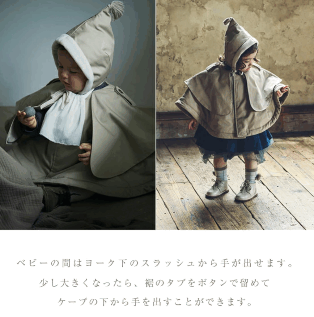 ポンチョタイプのアウターは、赤ちゃんの頃はおくるみとして、歩くようになったらアウターとして着られて長く使えるのでギフトにもおすすめです。