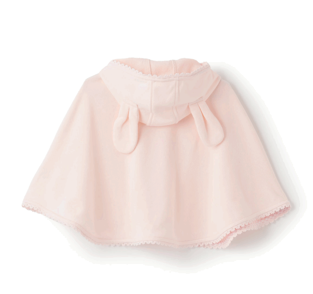 とにかくかわいい!ベビー用ケープ。ちりばめられたリボンや、フードについたうさ耳など全方位抜かりなくかわいいケープです。優しい肌触りや、チェックのパイピングなど困中部分にもこだわり。肌寒い時期にサッと羽織れる便利なケープです。