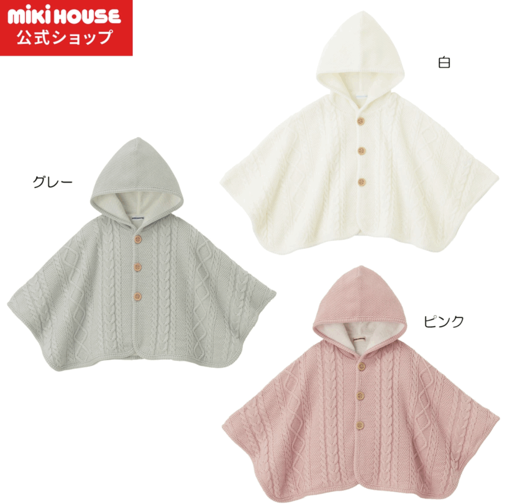 ケーブル編みのニットケープ。清楚なイメージでお出かけやカジュアルな着まわしのはおりものに便利。あたたかみのある上品なケープやマントは、生まれてすぐから、ご退院、お宮参り、お出かけと、2歳頃まで使えて出産のお祝いやギフトにもおすすめです。