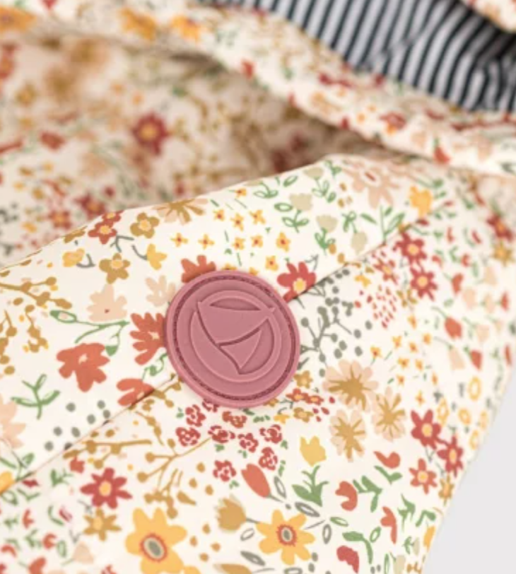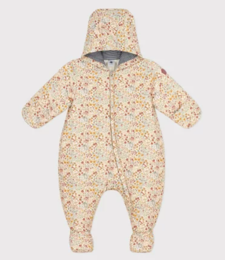 全身をすっぽりと包み込むカバーオールは真冬の寒い時期のお出かけにおすすめのアイテム。軽くて型崩れしにくいリサイクル素材を使用し環境にも配慮した一着です。愛らしいフラワー柄とフードの内側にあしらわれたアイコニックなミラレボーダーがデザインのポイントとして目を引きます。フロントには左足首にかけて大きく開くファスナーを施してあるので、ベビーの脱ぎ着も簡単。