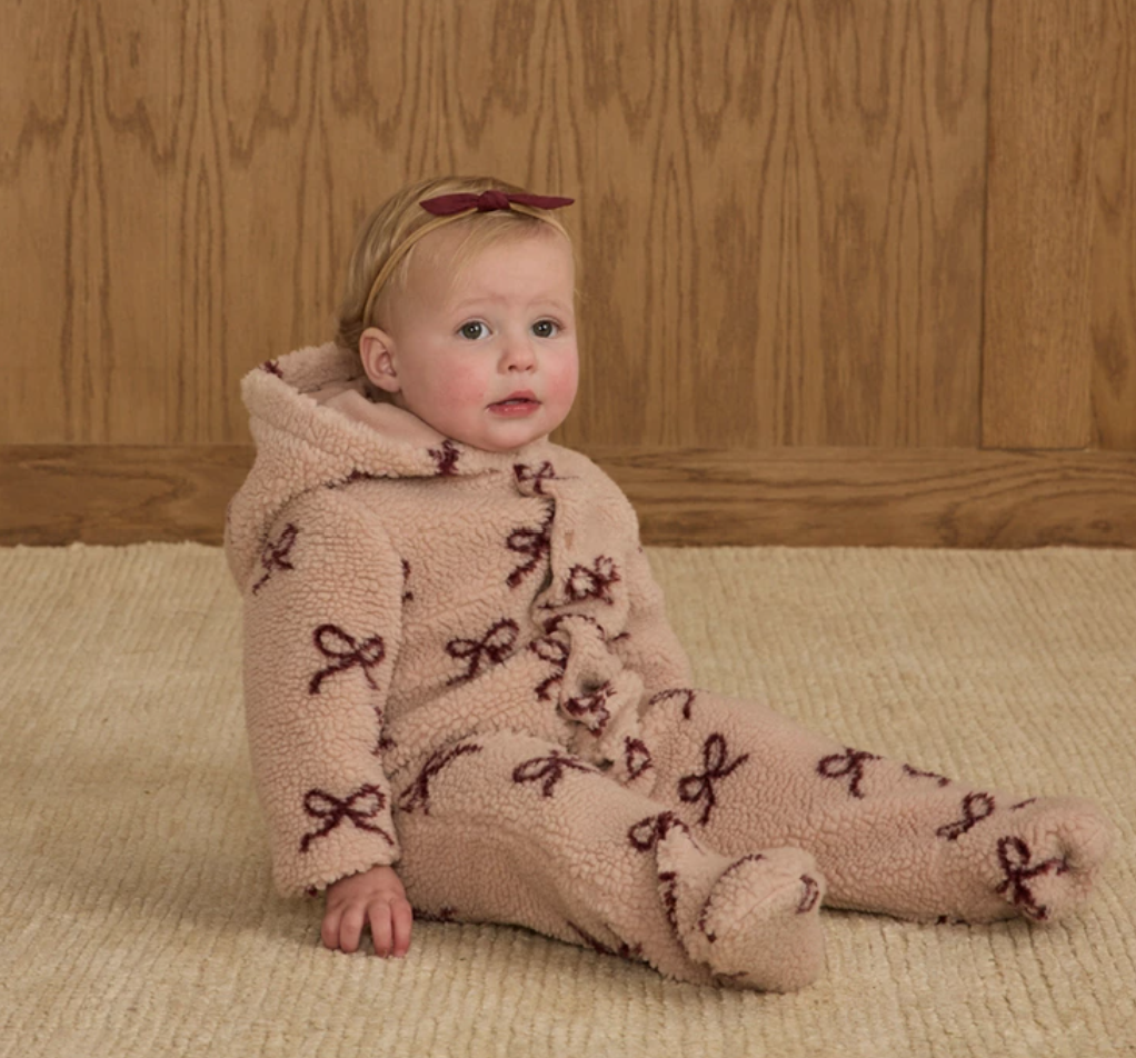 柔らかなシアリング素材を使用し、フードと胴体部分はフリースの裏地、腕と脚にはシルキーでマットなポリエステルの裏地を使用したあたたかなベビー用ジャンプスーツ。かわいいリボン柄とナチュラルなカラーで肌触りやデザイン性にもこだわっています。