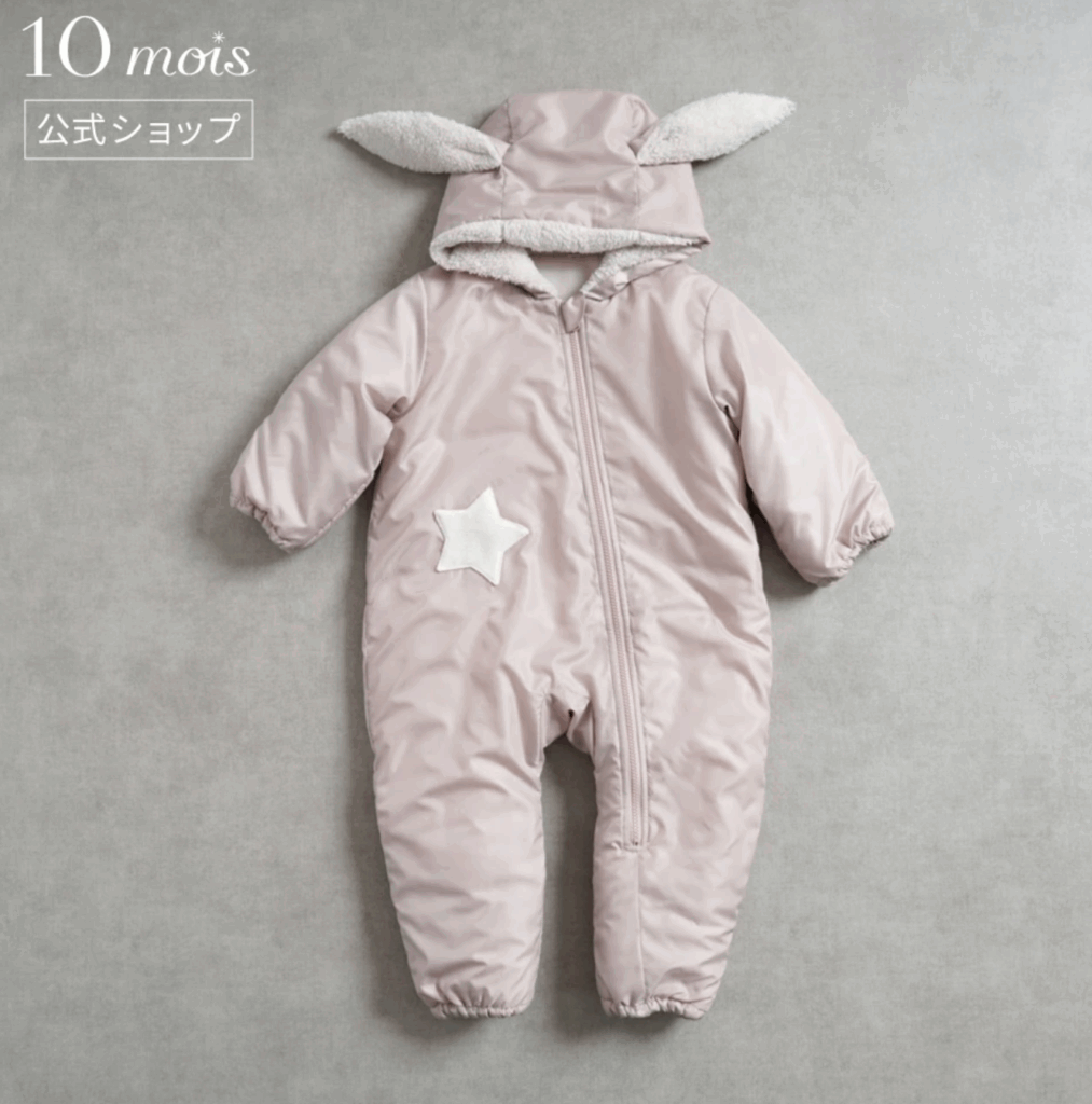 おしゃれなベビーグッズが人気のディモア。撥水加工で雨が染み込みにくく、手先や足先までしっかりくるんで暖かく着られます。着脱もしやすく、うさ耳も可愛いデザインです。内側はフリース素材で暖かく、中綿入りで、袖裏は表地と同生地にしており、袖通しが良くなっています。