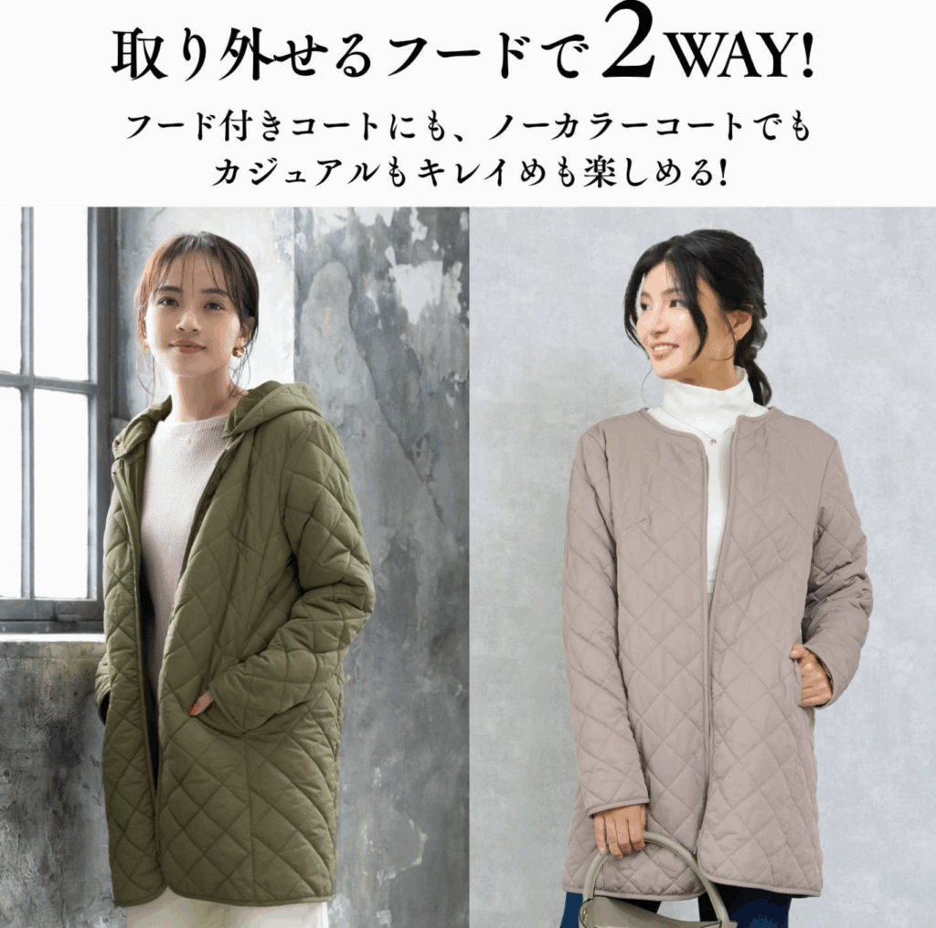 おんぶの時にも使える3WAYママコート。フードを外してノーカラーコートとして着ればキレイめカジュアルの完成。背中側にもダッカーを装着できるので抱っこだけでなくおんぶにも使えます。雰囲気を変えて着られて、2人目の時のおんぶでも重宝する多機能ママコートです。