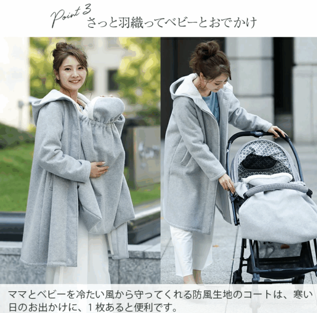 赤ちゃんを抱っこしたまま使えるダッカー付きのママコート。裏ボア生地で暖かく、薄手のシルエットながら防風フィルムを挟み込んでいるので外気の侵入を防いで暖かく包んでくれます。ダッカーはベビーカーブランケットとしても使え、フード付きなので赤ちゃんの頭や首元も暖かく包みます。