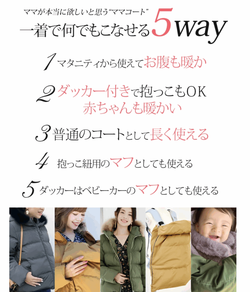 カラーバリエーションも豊富でおしゃれなママコート。ダウンで暖かく、スッキリとしたシルエットで産前産後、普通のコートとしても使用できます。スタイリッシュでとってもおしゃれなデザインはキレイめコーデにもぴったり。ベビーカーマフとしても使えるダッカーは、温かく袋状になっているので赤ちゃんが足を動かしてもしっかりフィットします。