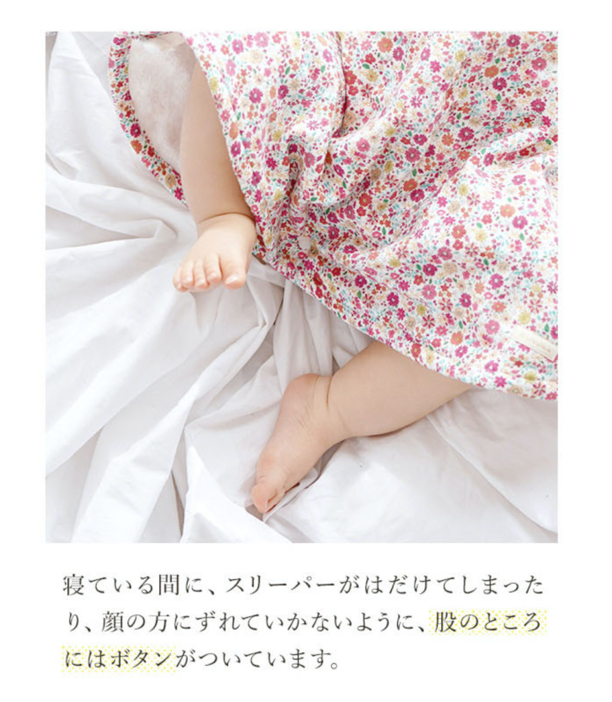 スリーパーは寝返りや寝相が悪くて布団からはみ出てしまっても寝冷えを防いでくれるので安心です。新生児期など「まだ寝返りしないから必要ないかな?」という赤ちゃんも、意外と足を動かしたりして布団がズレていることも。新生児の場合、赤ちゃんの顔を布団で防いでしまうことで起こりうる乳幼児突然死症候群(SIDS)の予防対策にもなります。