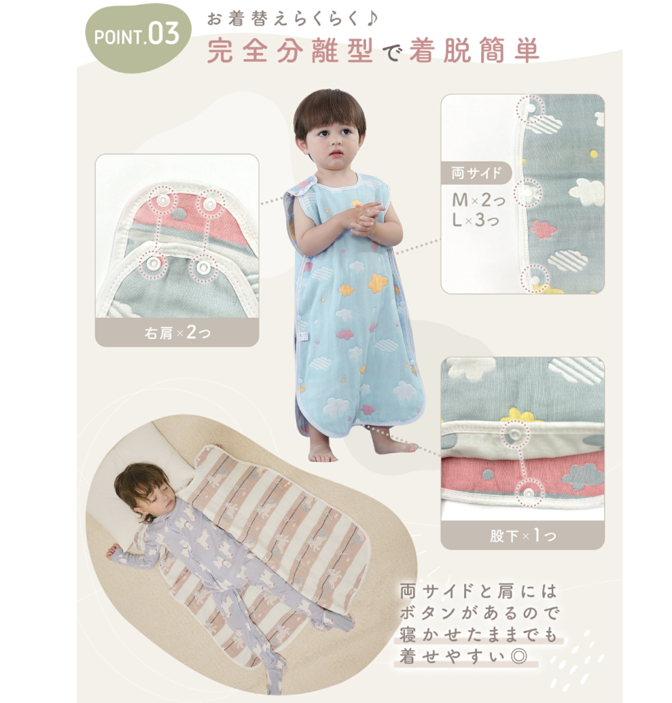 大きすぎるサイズは寝返りが打ちにくくなり睡眠の妨げになりますので、身体に合ったサイズを選びましょう。スリーパーはベストのようにすっぽりとかぶるタイプが多くありますが、ロンパースのように股下をボタンで留めるタイプなら下から捲れてこないのでお腹が冷えずに安心です。