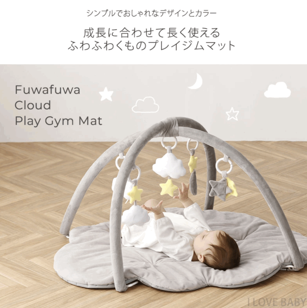 まるで雲の上にいるようなふわふわの雲のマットと、星や月などのおもちゃがとってもかわいいベビージム。マットだけでお昼寝やオムツ替えにも使えるなど、成長に合わせて長く使えます。おもちゃは取り外してベビーカーなどにも取り付けられるのでシーンに合わせて使えますね。