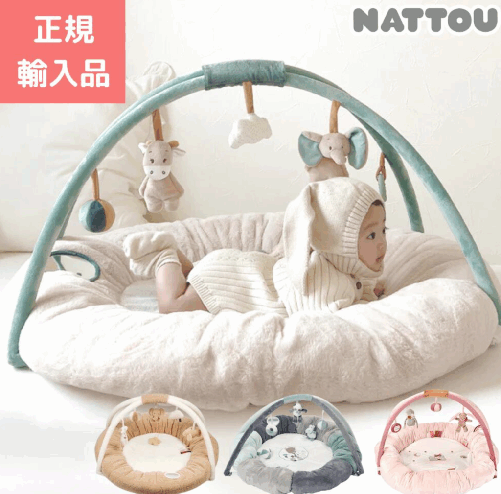 優しいカラーとフワフワした触り心地がかわいすぎるナチューのプレイジム。知育にもなる仕掛けがたくさんついたおもちゃやナチュラルカラーがインテリアにも合うデザインなど、親子で嬉しいアイテムです。アーチを外せばオムツマットとしても使えるので長く使えておすすめです。