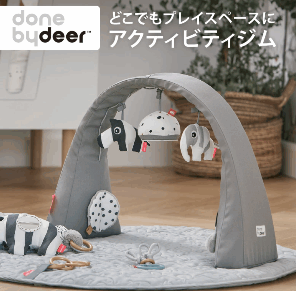 デンマークのベビーグッズメーカーダンバイディアーのベビージムはとってもスタイリッシュ。簡単に持ち運べて省スペースなので、ベビーベッドなどでも使えます。高さ調節もできるのでねんねの時期だけでなくおすわりの時期でも楽しめますよ。
