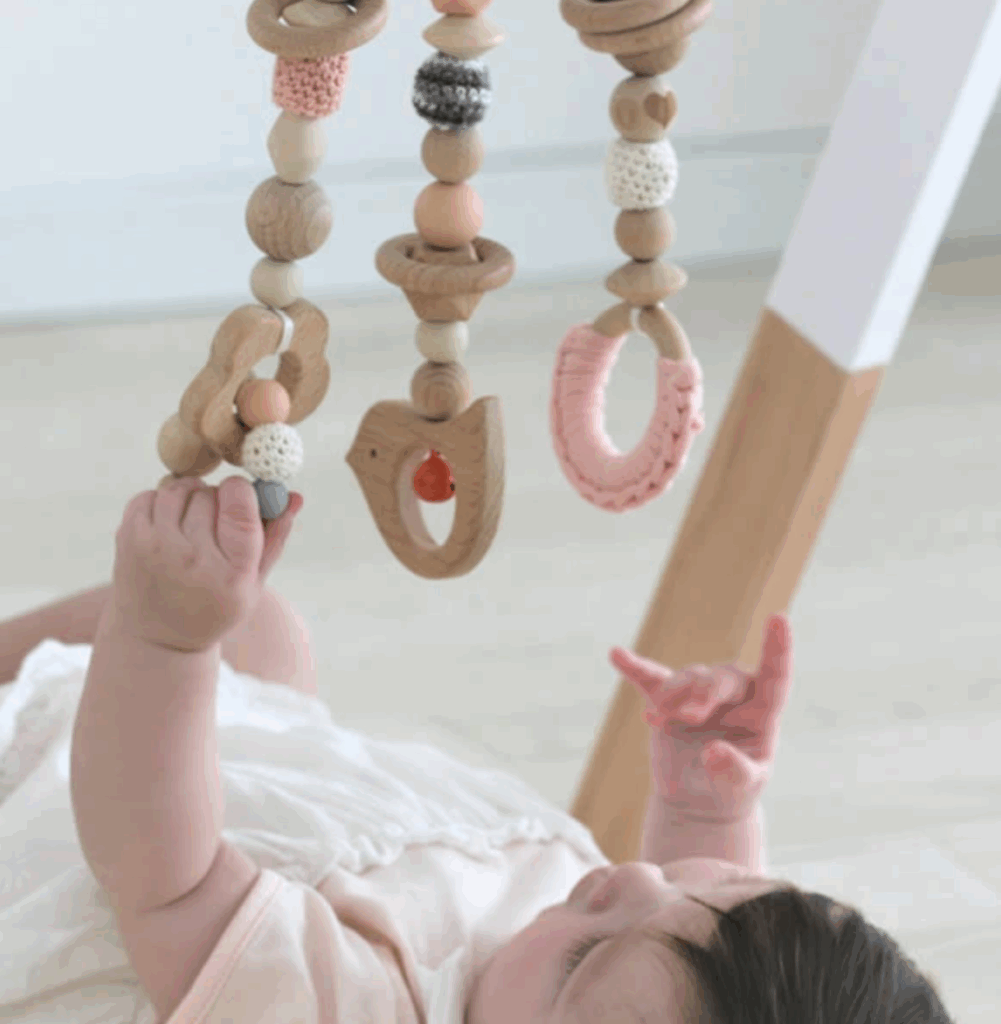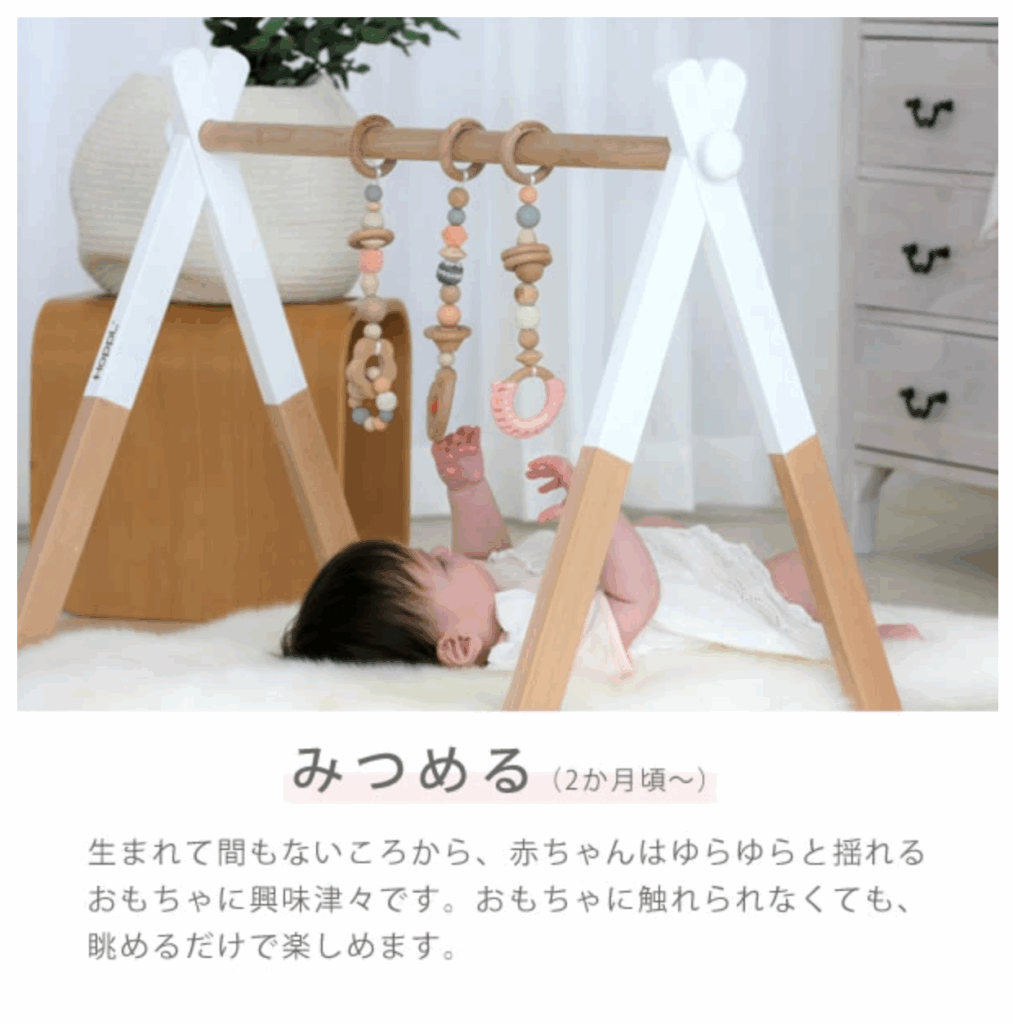 ナチュラルな木の風合いが優しくておしゃれなベビージム。おもちゃを増やしたいときは単品でも購入できるので好きなおもちゃの組み合わせで楽しめます。様々な触り心地のおもちゃは手先の感覚を刺激して好奇心を養うサポートをします。省スペースで畳めるので使わない時はコンパクトになりますよ。