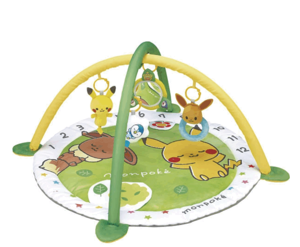 ポケモンの公式ベビーグッズブランドモンポケのベビージム。かわいいポケモンキャラクターが赤ちゃんグッズになって登場。草原で寝ているかのようなかわいいデザインと、目を惹くキャラクターのおもちゃが親子で夢中になれるベビージムです。