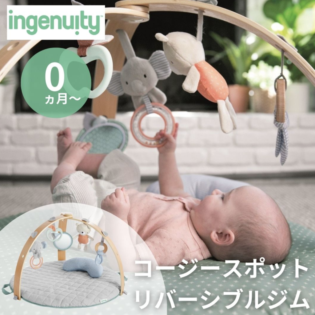 ふわふわのマットはリバーシブルでお部屋の雰囲気に合わせて変えられます。洗練されたおしゃれなデザインのベビージムは折り畳み式でコンパクトに持ち運べるので帰省などでも使えますね。やさしい印象のおもちゃはとってもかわいくて赤ちゃんが持ちやすい設計になっています。